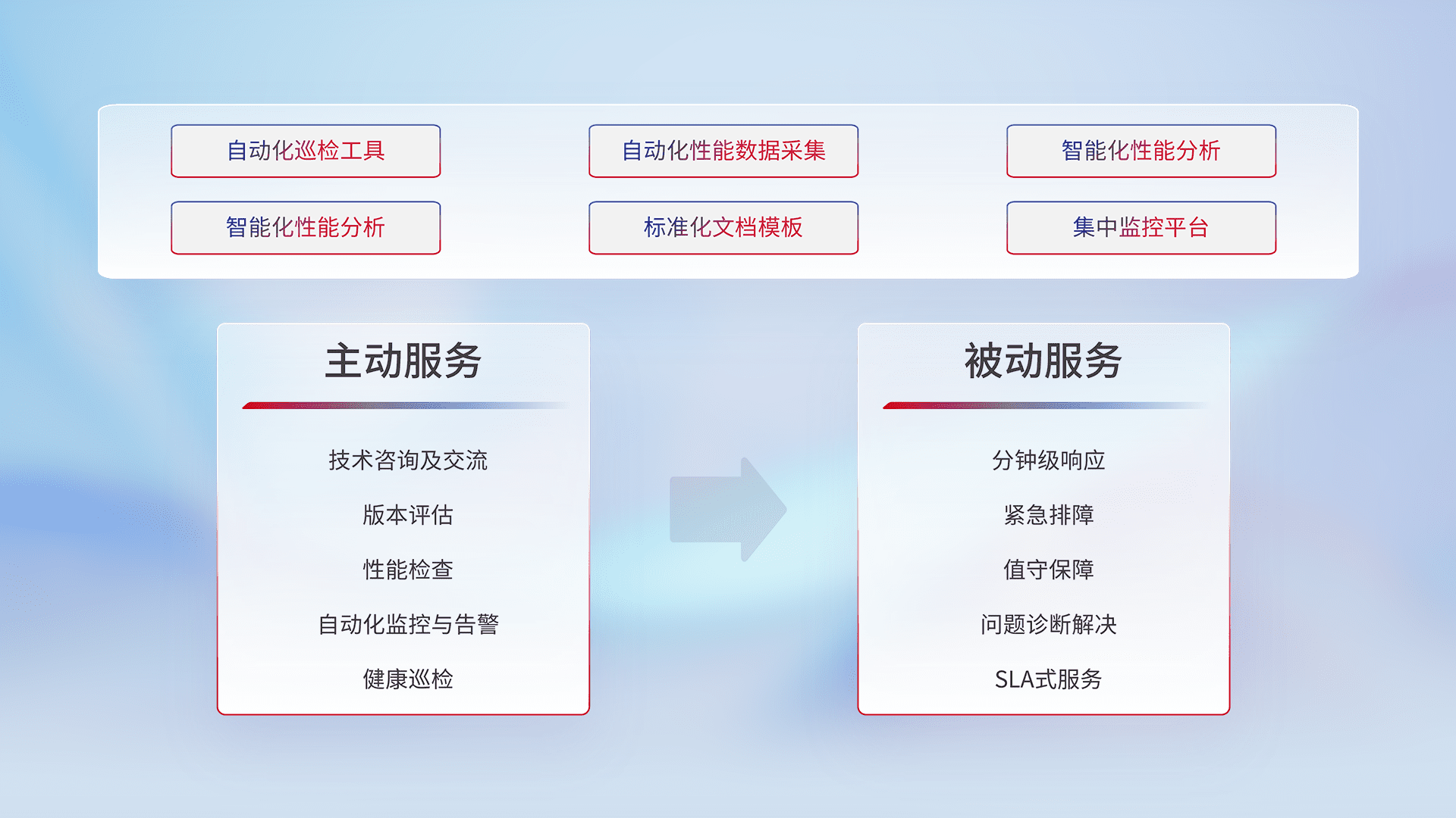 智能化工具和标准化文档,,,,保障服务质量,,,提供主动服务(包含技术咨询、、版本评估、、、性能检查、、自动化监控与告警、、、、健康巡检)和被动服务包含(分钟级响应、、紧急排障、、、、值守保障、、问题诊断解决、、、、SLA服务)。。